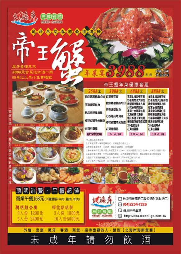 北海岸海鮮餐廳是台中海鮮餐廳的第一選擇,優點說也說不完!現在因應年節即將到來更推出了超級豪華的帝王蟹年菜宴喔!!